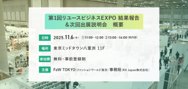 日本最大のファッション展 FaW TOKYO 内で開催する“リユースビジネス” をテーマにした展示会です。 リユース事業(買取・販売・EC・物流・メンテナンス)の参入を検討しているアパレルメーカー、セレクトショップ、専門店、 百貨店などの一次流通企業と新規販路開拓・ビジネス商談ができます。全国から23,000名※が来場します。 春展:2026.4.8(水)~10(金) 秋展:2026.10.7(水)~9(金) 場所:東京ビッグサイト